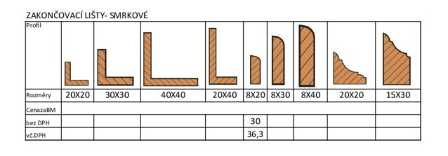 | DŘEVINA | Síla mm | Šířka mm | Délka m | Kvalita | Profil | Jednotky | Cena bez DPH | Cena s DPH |